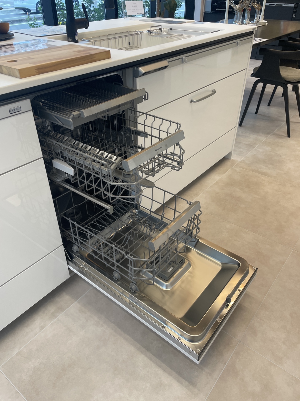人気の前面収納付きフラット対面式のキッチンです。フロントオープンの大容量食器洗い乾燥機付きです。