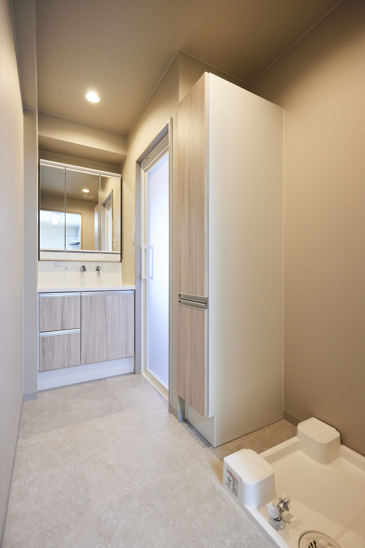 やわらかな木目と明るいトーンでまとめ、清潔感と使いやすさが心地よく備わった洗面室。
