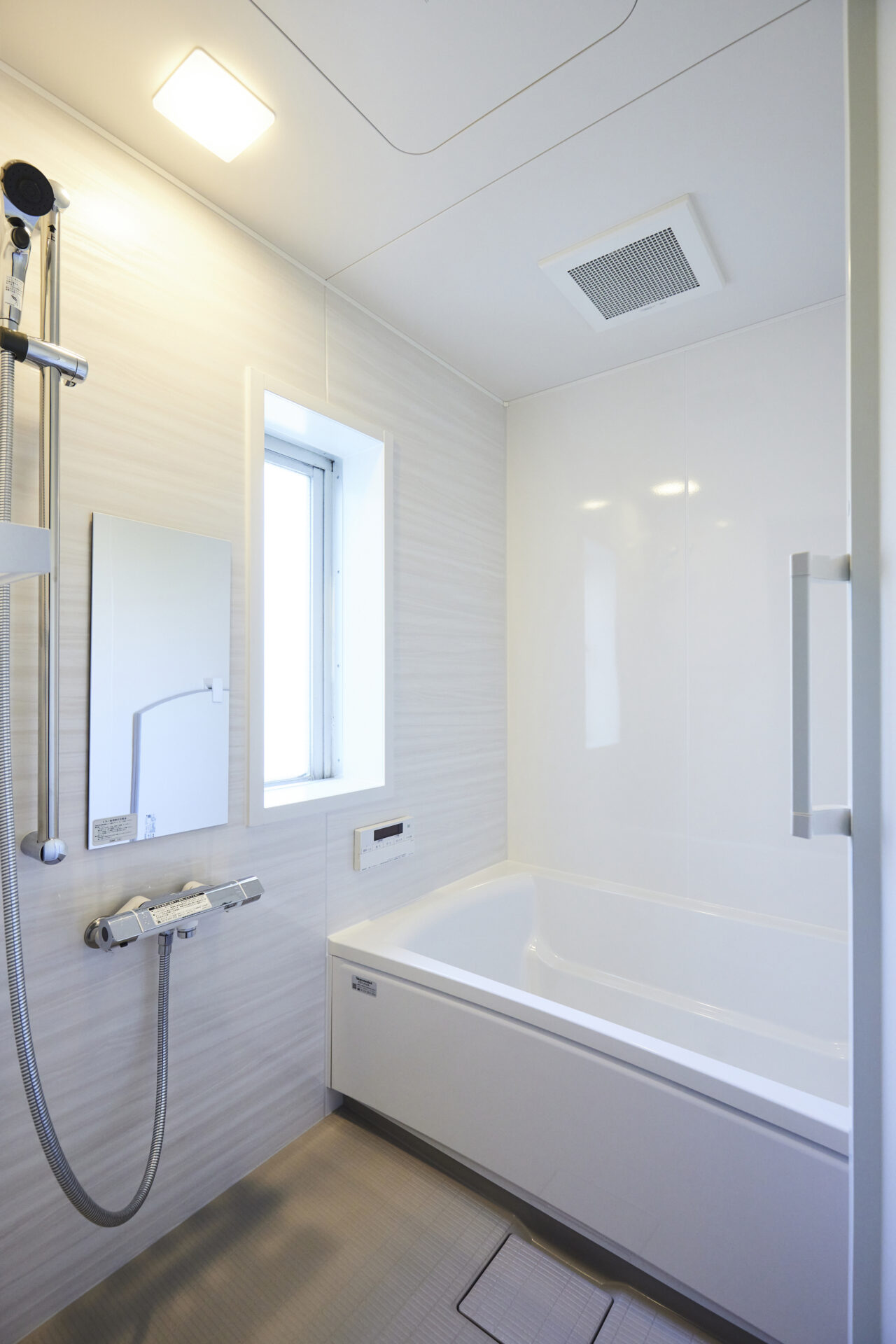 やわらかな光が白を引き立てる、コンパクトで機能的に収まる清潔感あふれるバスルーム。