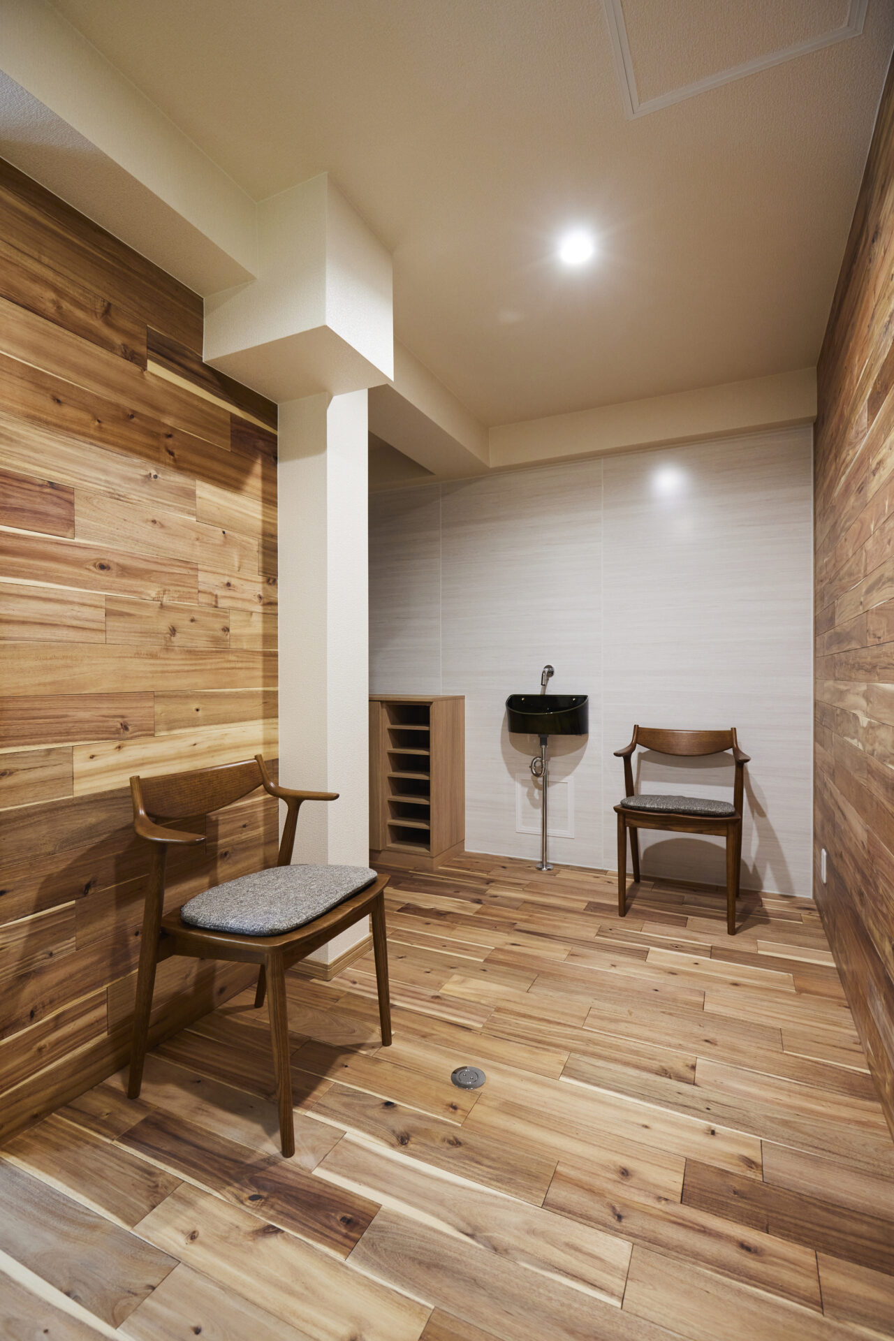店舗兼用の待合スペースには、無垢材を床と壁に。素材の風合いが活きた空間は、訪れる人にとっても心地よい居場所になっています。