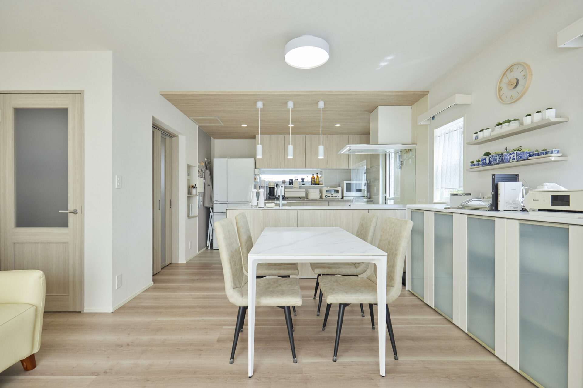 下がり天井が空間をやわらかく区切り、明るさと一体感が広がるリビングダイニング。