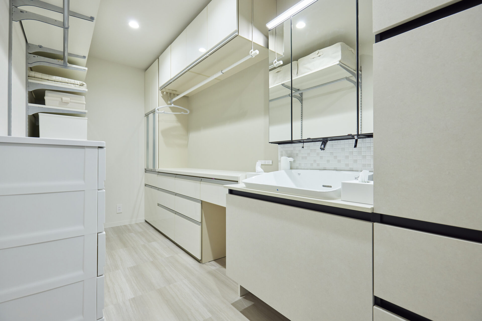 脱衣所を独立させ、収納と作業スペースを充実させた明るく使いやすい洗面室