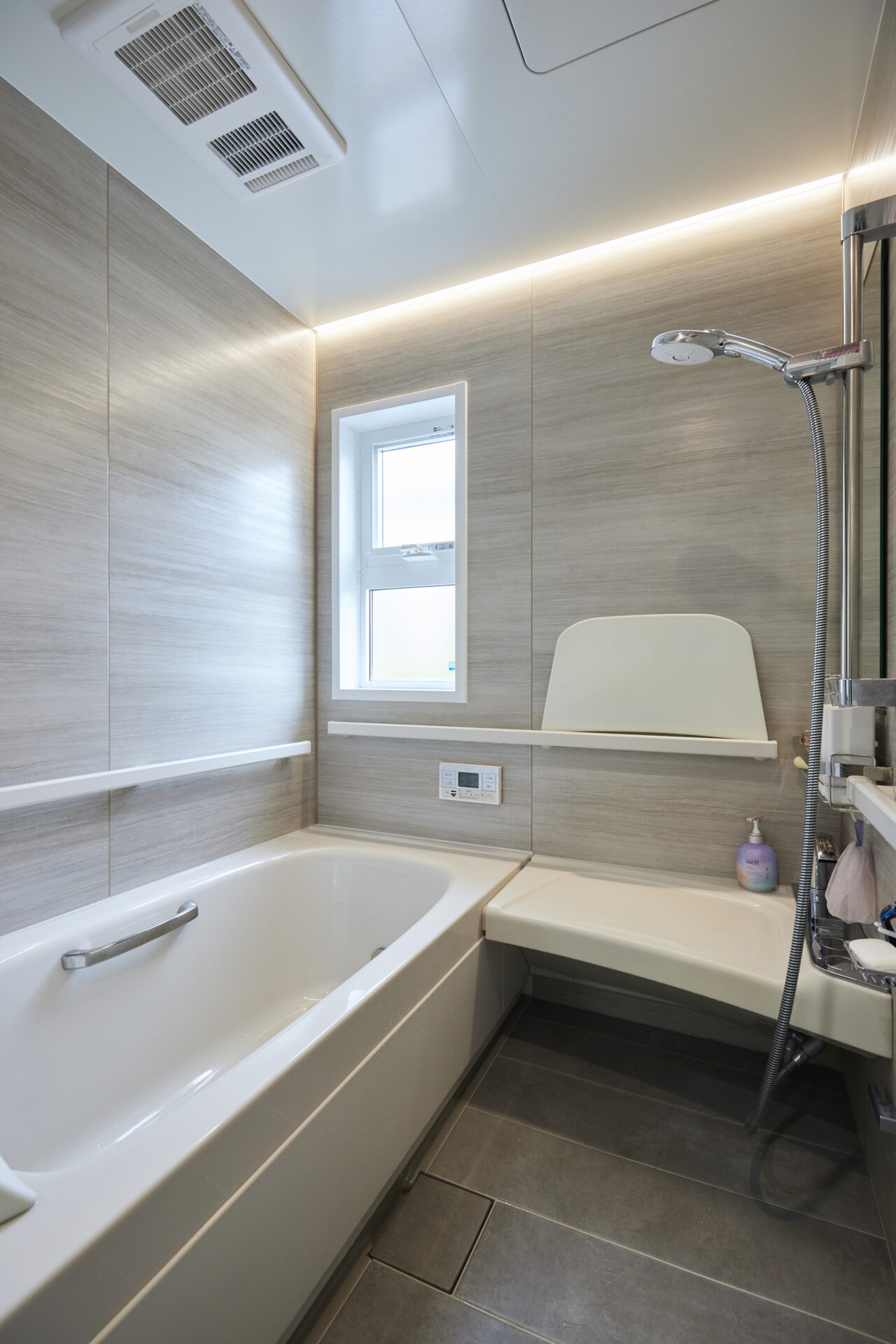 手すりを追加し、落ち着いた壁面と合わせて安心感と使いやすさを高めたバスルーム。