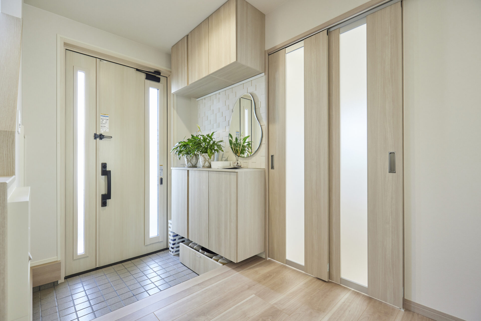 下駄箱と引き込み戸の色味に統一感を持たせ、明るさと収納力を両立させた玄関スペース。