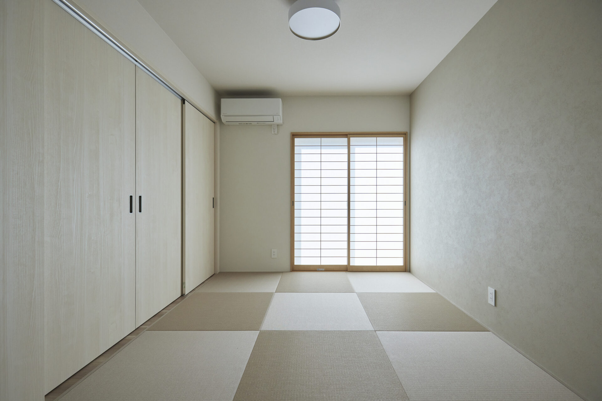 やわらかな畳の色合いと障子の光が心地よい、シンプルで落ち着いた和室。